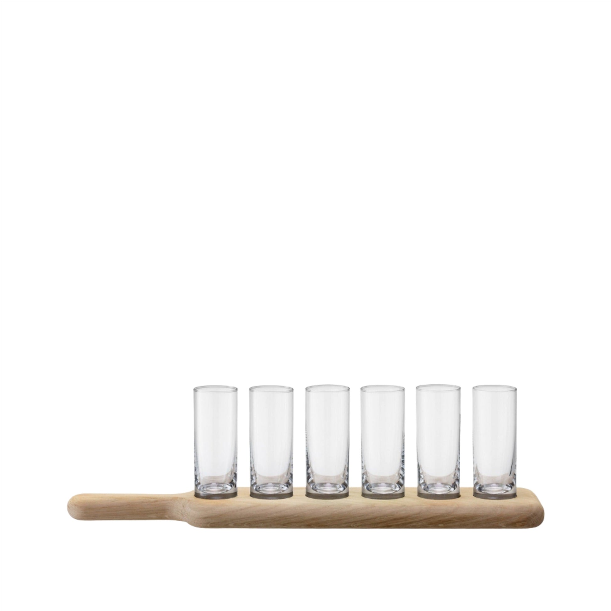A mixed material party set. Six shot glasses nestle securely along the length of the natural oak board. The paddle has slim handles at either end. For serving vodka, tequila and other spirits.