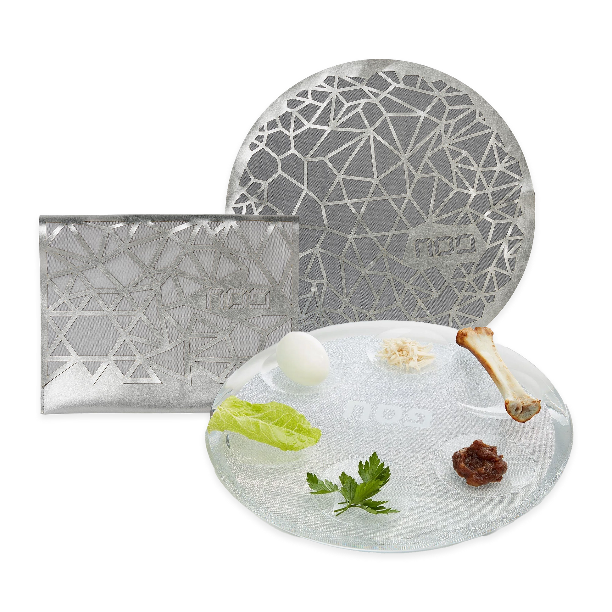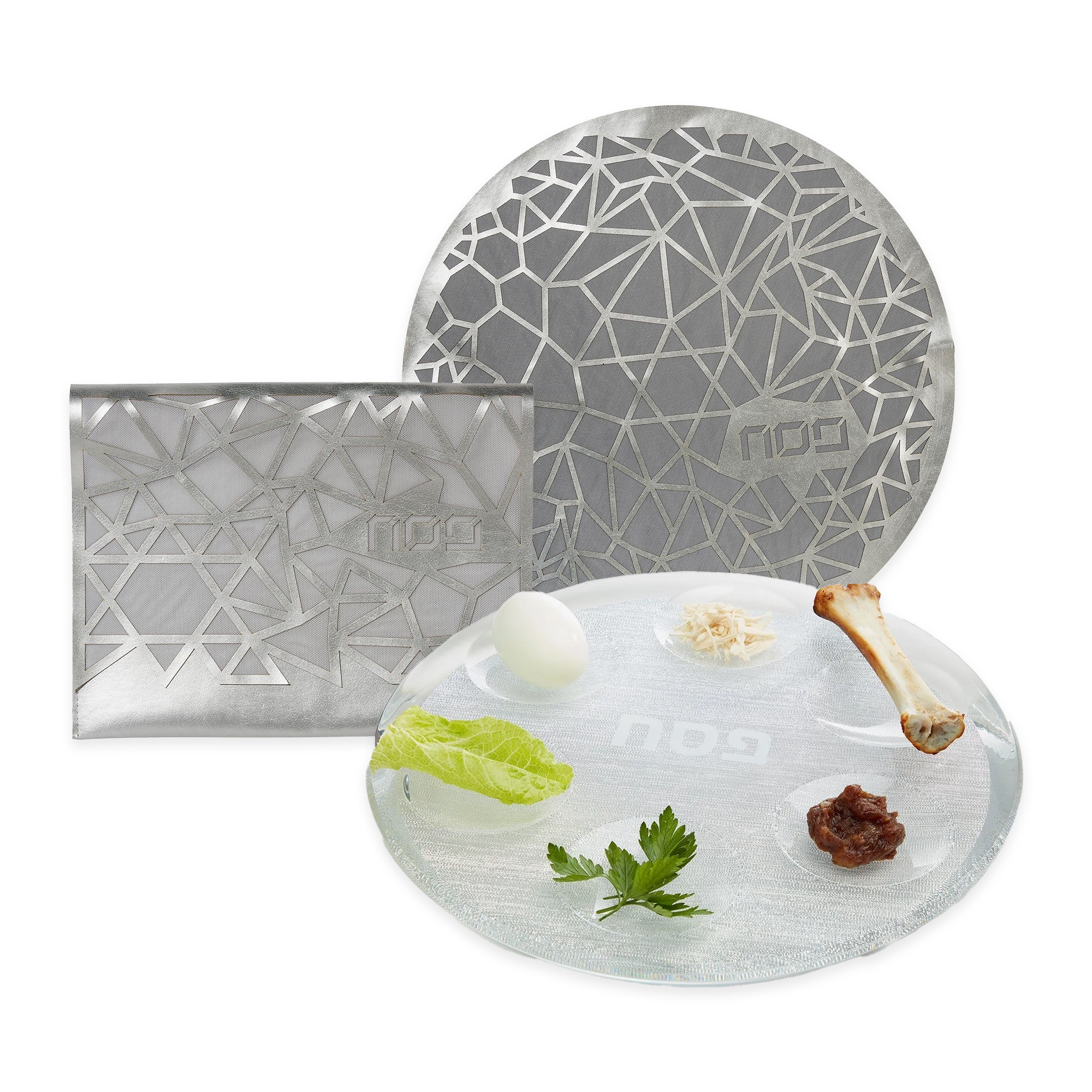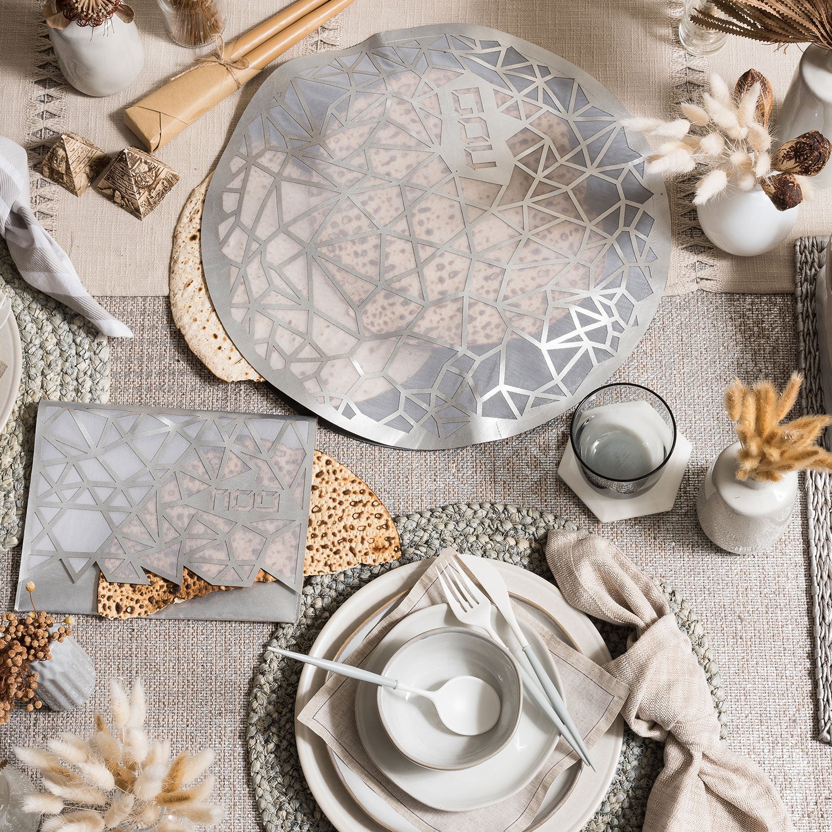 Celebrate Passover with a timeless and coordinated silver set. The sleek Passover plate serves as a beautiful centerpiece, while the geometric Matzah cover and Afikoman bag add a modern, sophisticated touch. A stunning combination designed to elevate your Seder traditions.