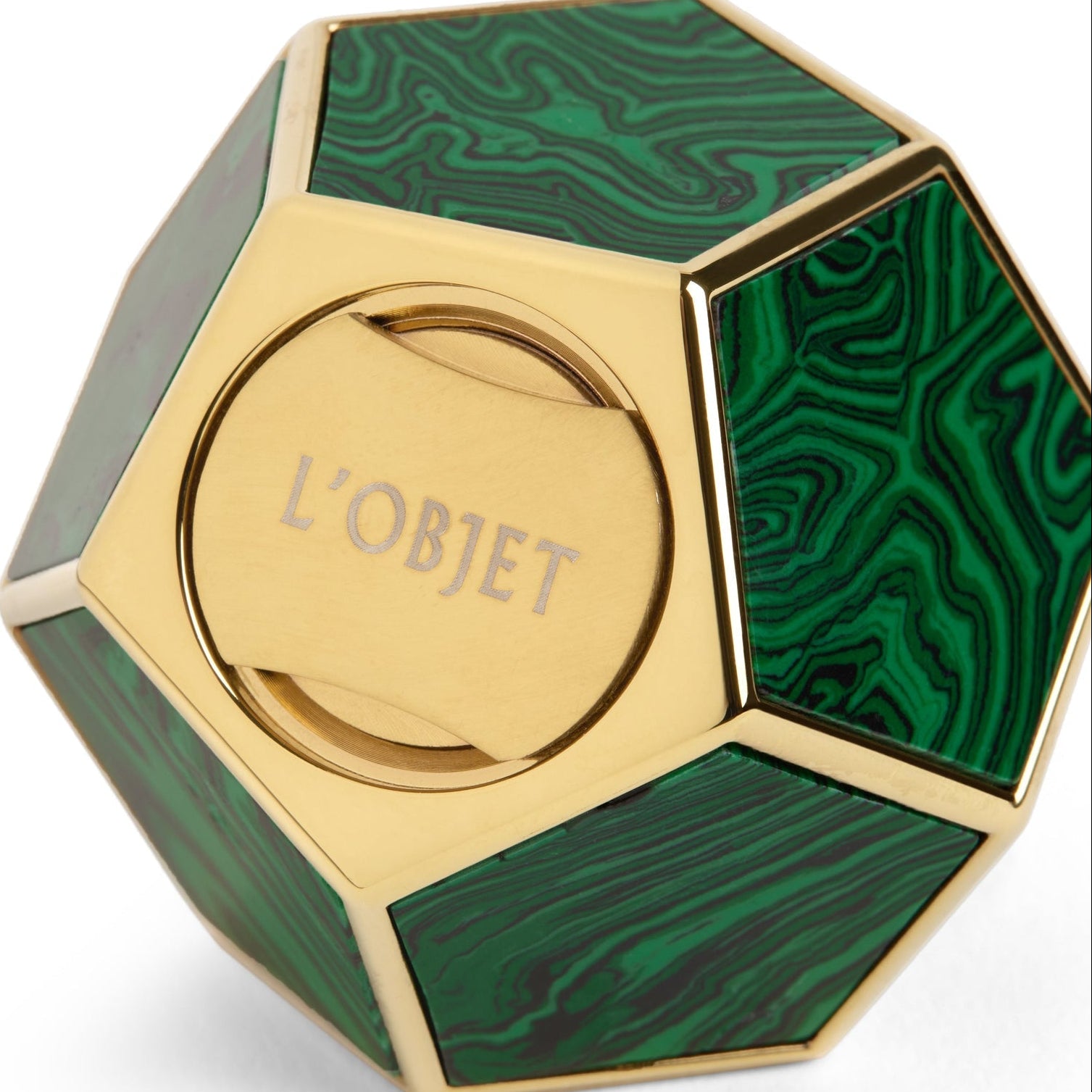 Handcrafted with meticulous attention to detail, featuring pentagon facets and gold-platted brass details. One of the pairs is fully adorned with malachite facets, a celebrated classic brand pattern.
