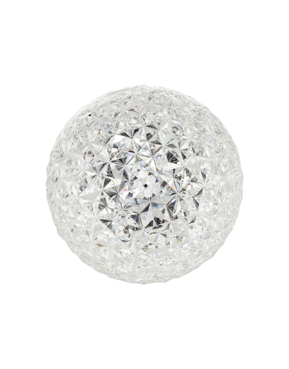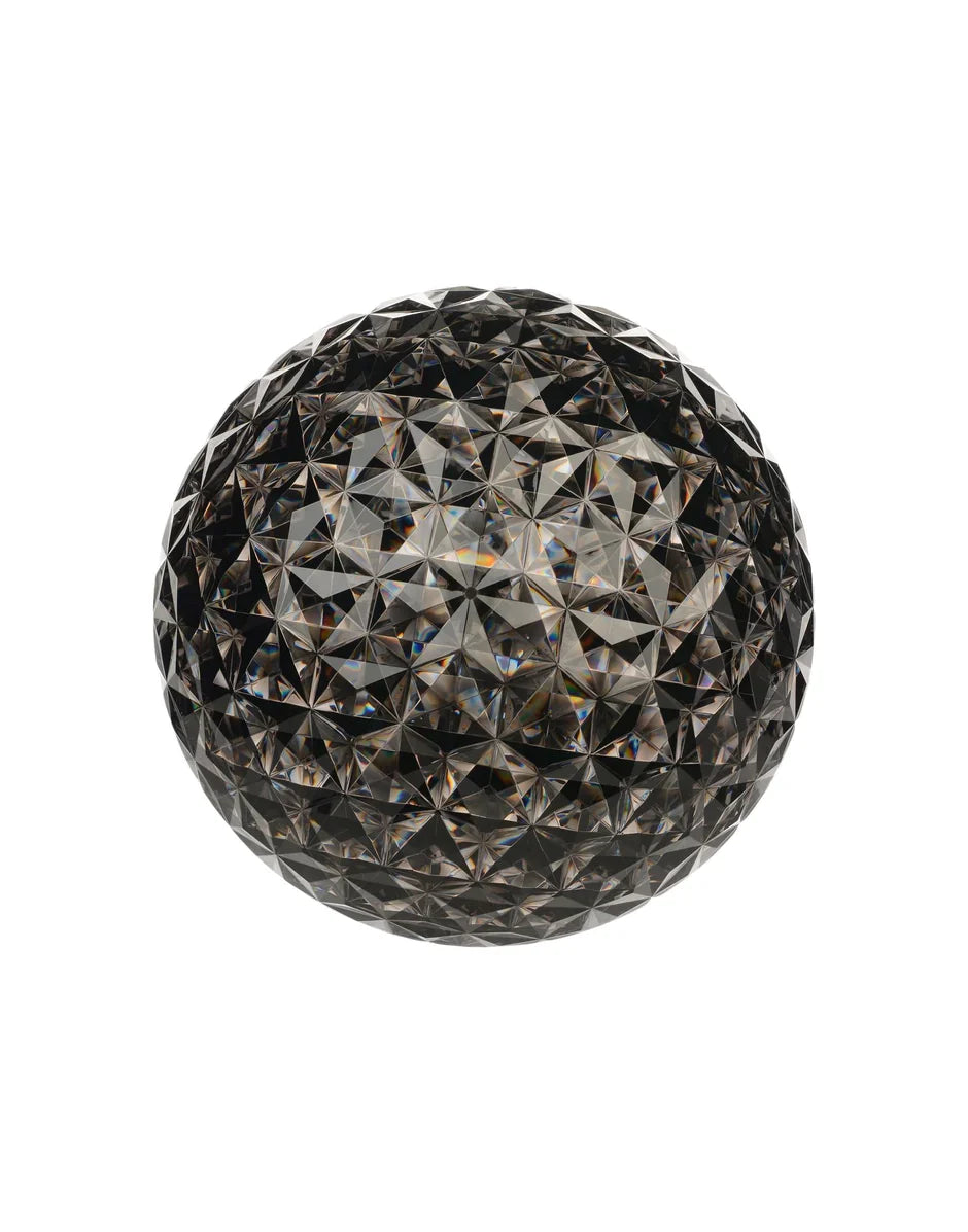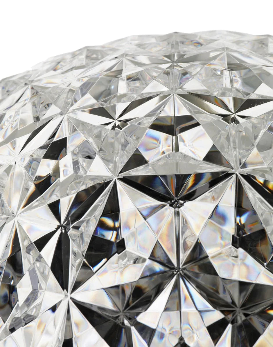 The distinctive trait is the shape of the slightly elliptical transparent diffuser, which is characterised by a multi-faceted surface, both inside and out, which creates a rich tapestry of reflections.