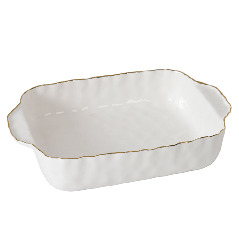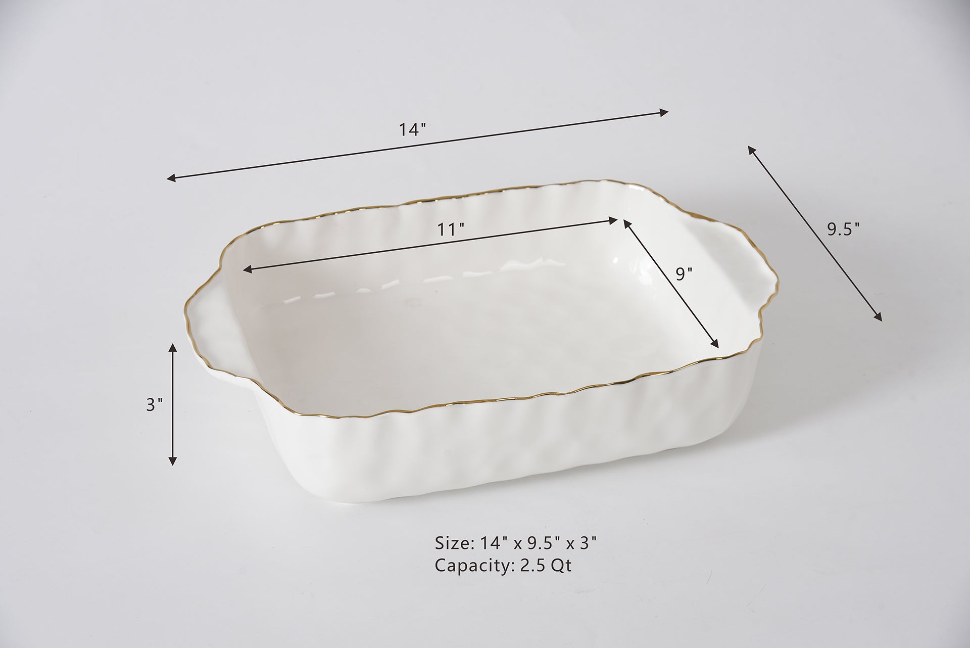 11″ x 9″ Rectangular Baking Dish in Portofino. Its spacious dimensions make it ideal for preparing family-sized casseroles, lasagnas, roasted vegetables, and desserts. With sturdy handles for secure grip and a timeless look that transitions seamlessly from oven to table, this baking dish is as practical as it is stylish. Beautifully crafted white porcelain with a delicate gold trim. Food safe, tarnish free, dishwasher safe, oven safe to 500°F. Easy Care. Capacity: 2.5 Qt