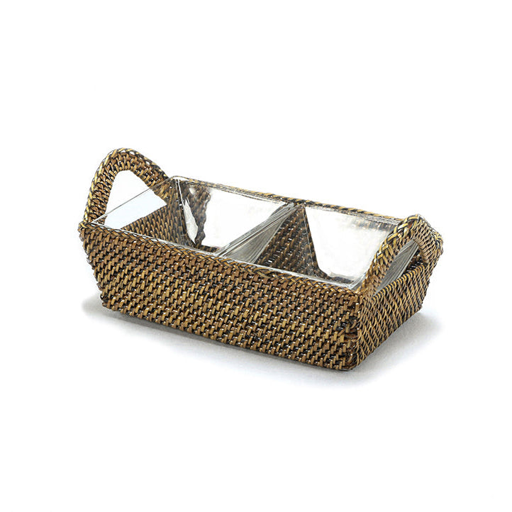 The serving dish comprises a traditional woven tray with easy-to-remove glass inserts.