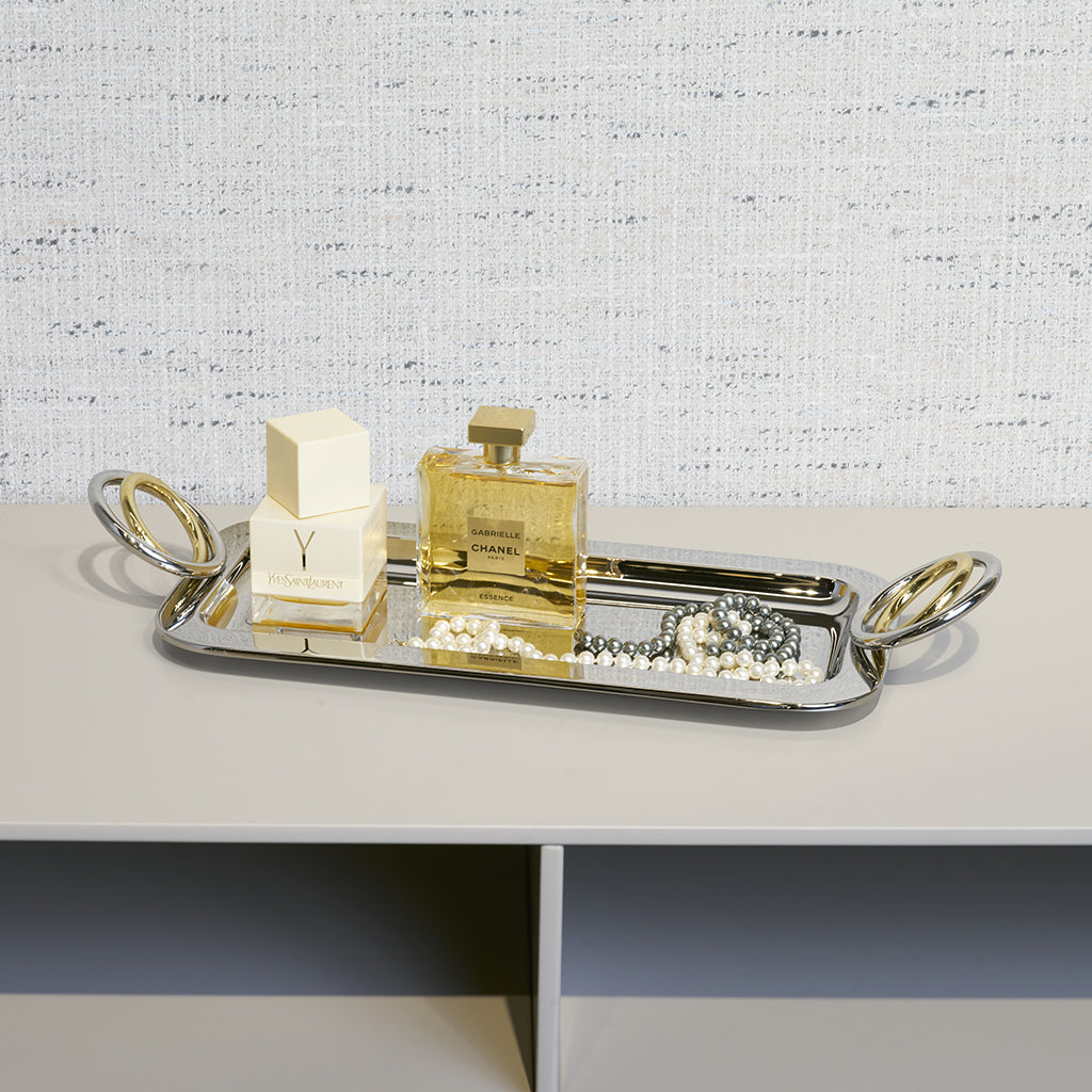 The strength of our Ring Small Rectangular Tray relies on its gold and silver rings leaning against each other—a visual metaphor for the importance of community. Crafted from stainless steel and solid brass, this versatile design is equally comfortable as a carrier of a trio of nut and candy bowls, or even a display of hors d’oeuvres or crudité. We hope that its design will encourage people to lean on each other for support.