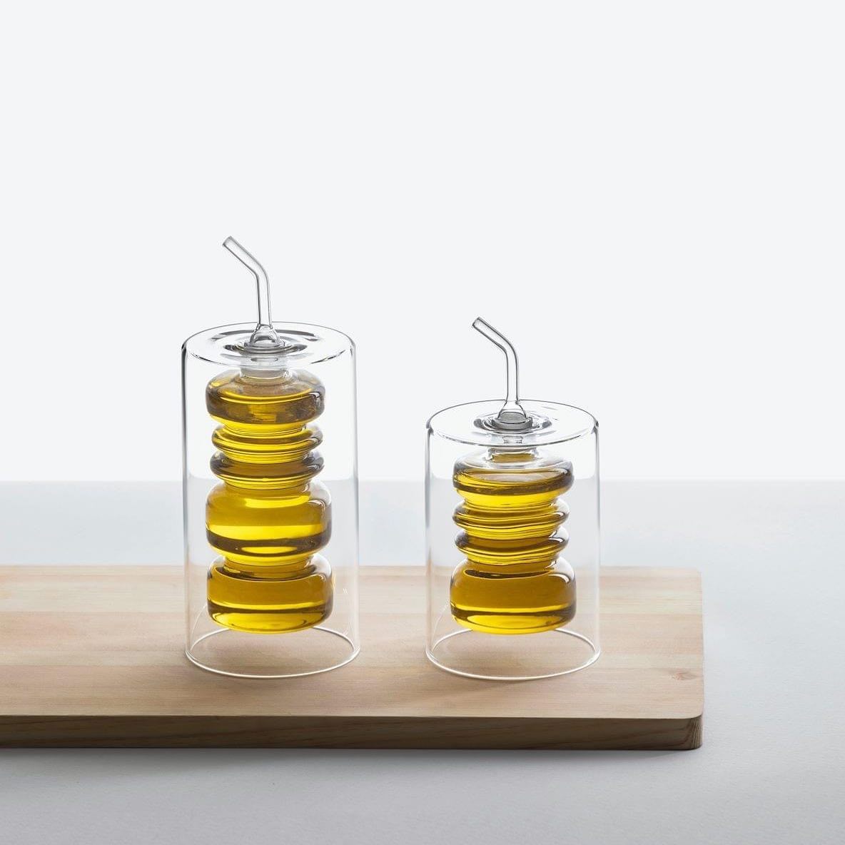 Olive Oil Bottle LargeCollection RingsDesign Corrado DottiColor ClearMaterial GlassManufacture Hand-made and flame-workedDiameter 3.15 "Capacity 7.4 ozHeight 6.5 "