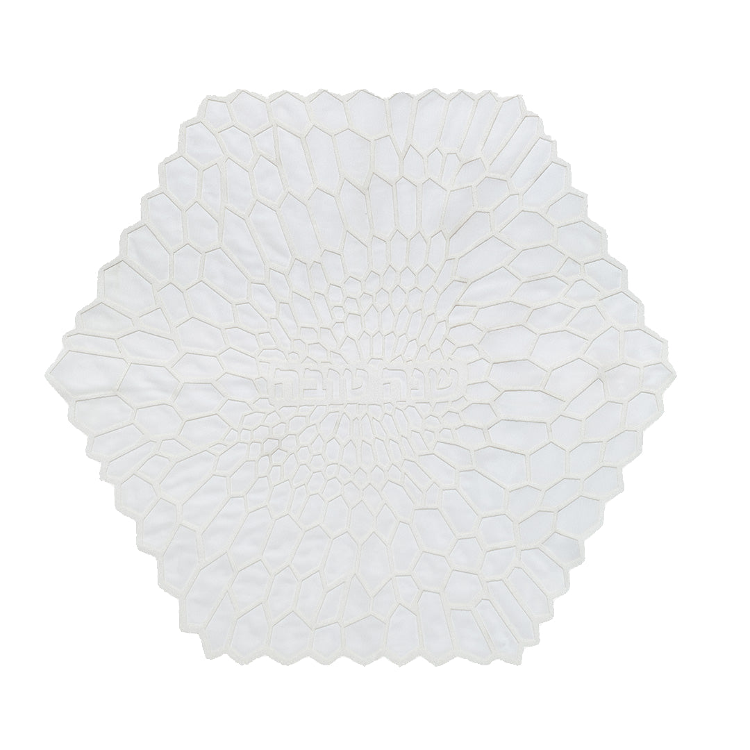 Taking inspiration from nature's beauty and the spirit of the Jewish New Year, our last creation features a design inspired by a bee's hive and pomegranate seeds - symbols of unity, fruitfulness, and the sweetness of a new beginning. Perfectly sized for round challah, this cover brings elegance and is a meaningful symbol to your Rosh Hashanah table.