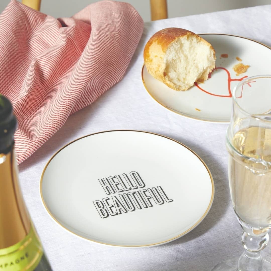 These playful, golden-rimmed plates are sure-fire conversation starters during appetizers, dessert, and every course in between. Choose from five charming phrases—Bonjour, Bon Appetit, Hello Beautiful, Love, and Thank You—or a romantic heart-and-arrow illustration.