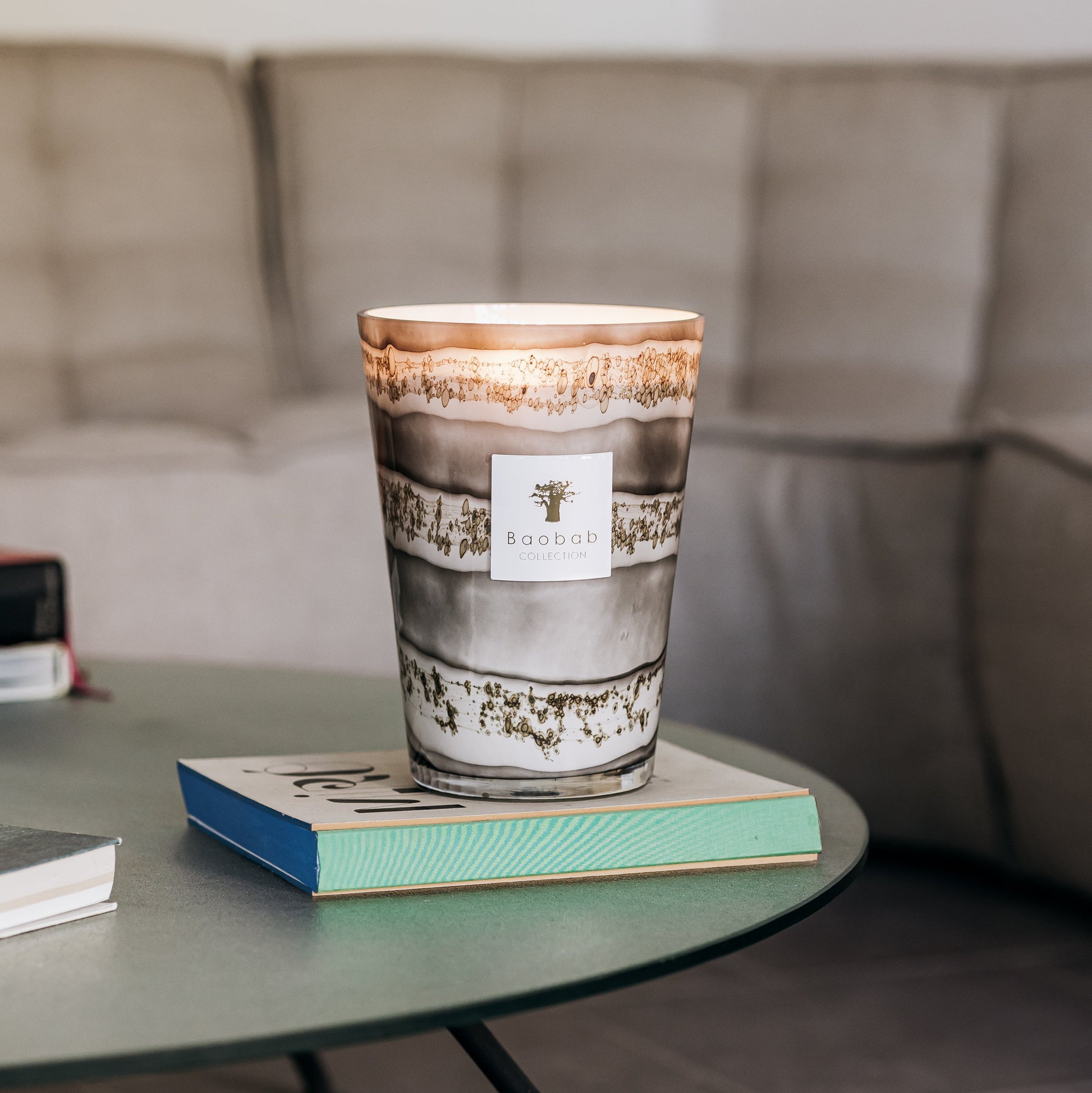 A hand-blown glass with subtle shades of gray was made by our glass artisans. Horizontal strata form gray stripes dotted with small round and organic shards. The Atacama scented candles are refined objects perfect for urban and chic interiors.