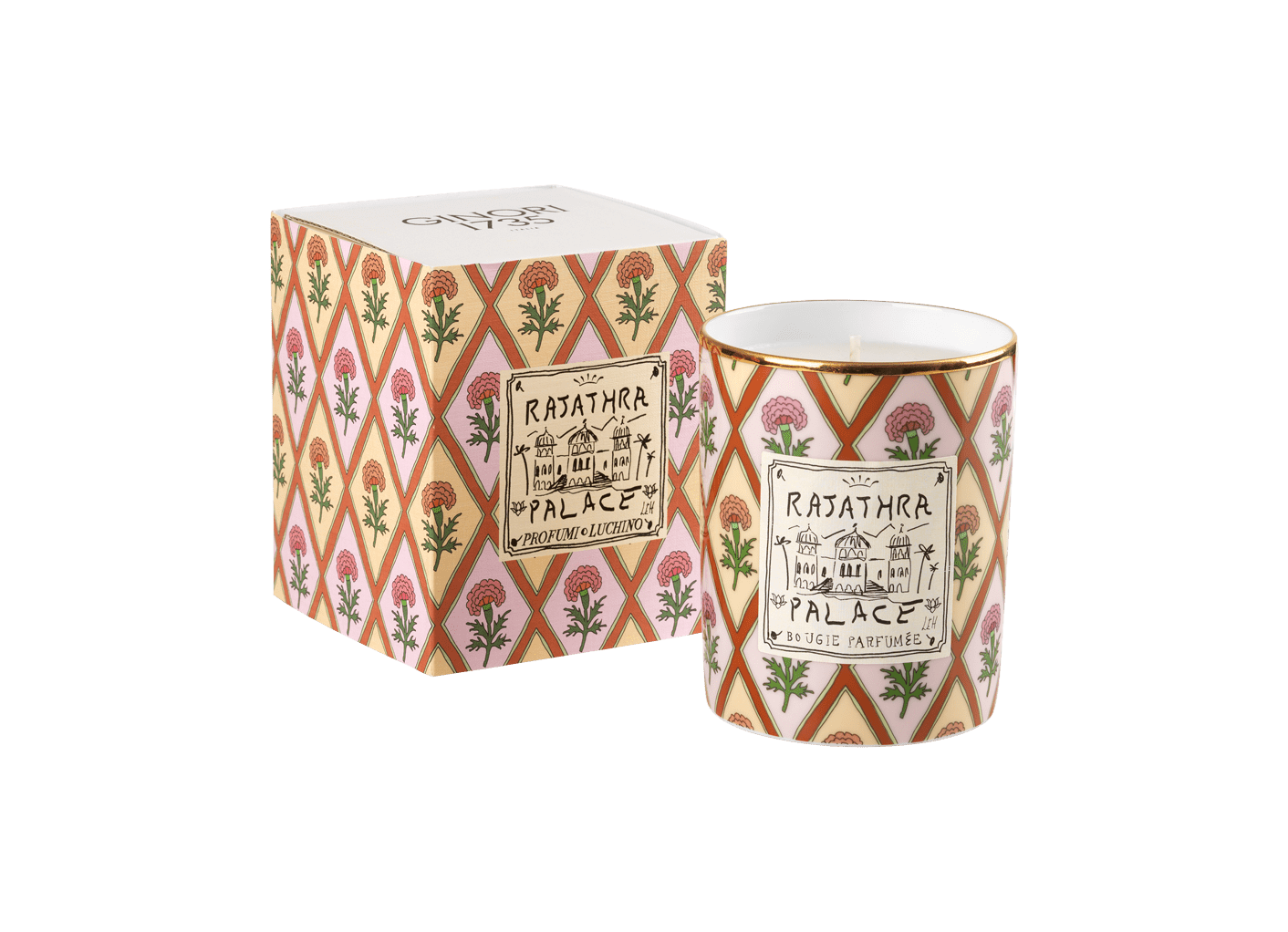 Rajathra Palace designer scented candle, with a pure porcelain body and a burning time of about 30 hours.