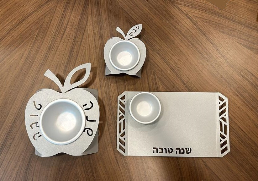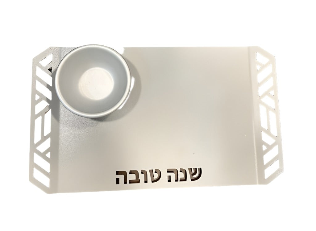 Tray, for apple with honey, made of metal with stainless steel. Includes aluminum honey pot. Inscription "tapuach udvash"