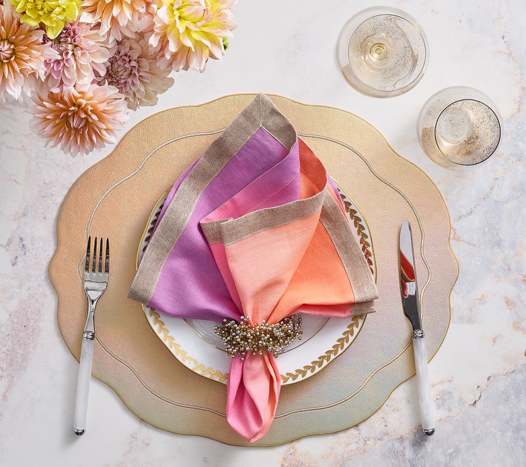 The Spray Napkin Ring features hand-attached gold glass beads. These beaded napkin rings are versatile enough to use throughout the year. In the fall, it will complement a festive Thanksgiving table and can be used on any elegant tablescape. As holiday napkin rings, they will sparkle with the twinkling lights.