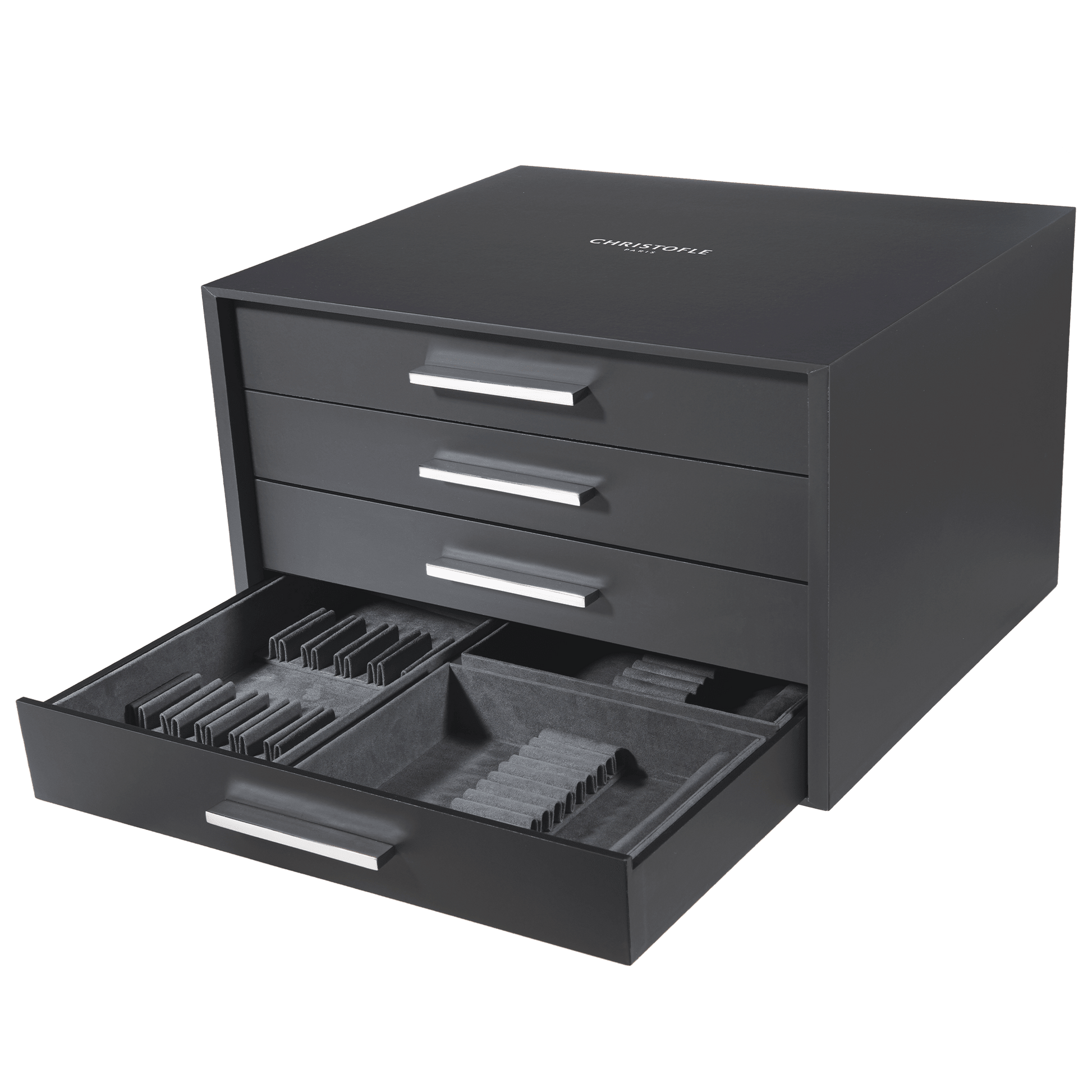 This storage chest has 4 drawers with modules included. It can contain 168 individual pieces or 156 pieces plus 1 module for serving pieces (without easel).