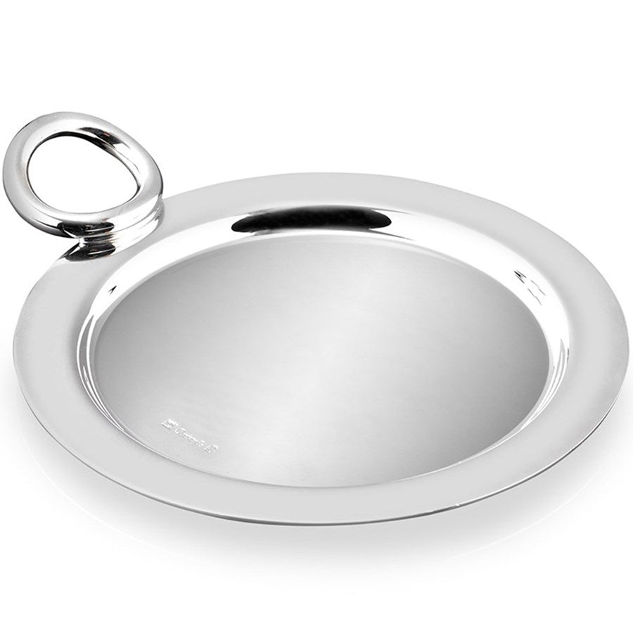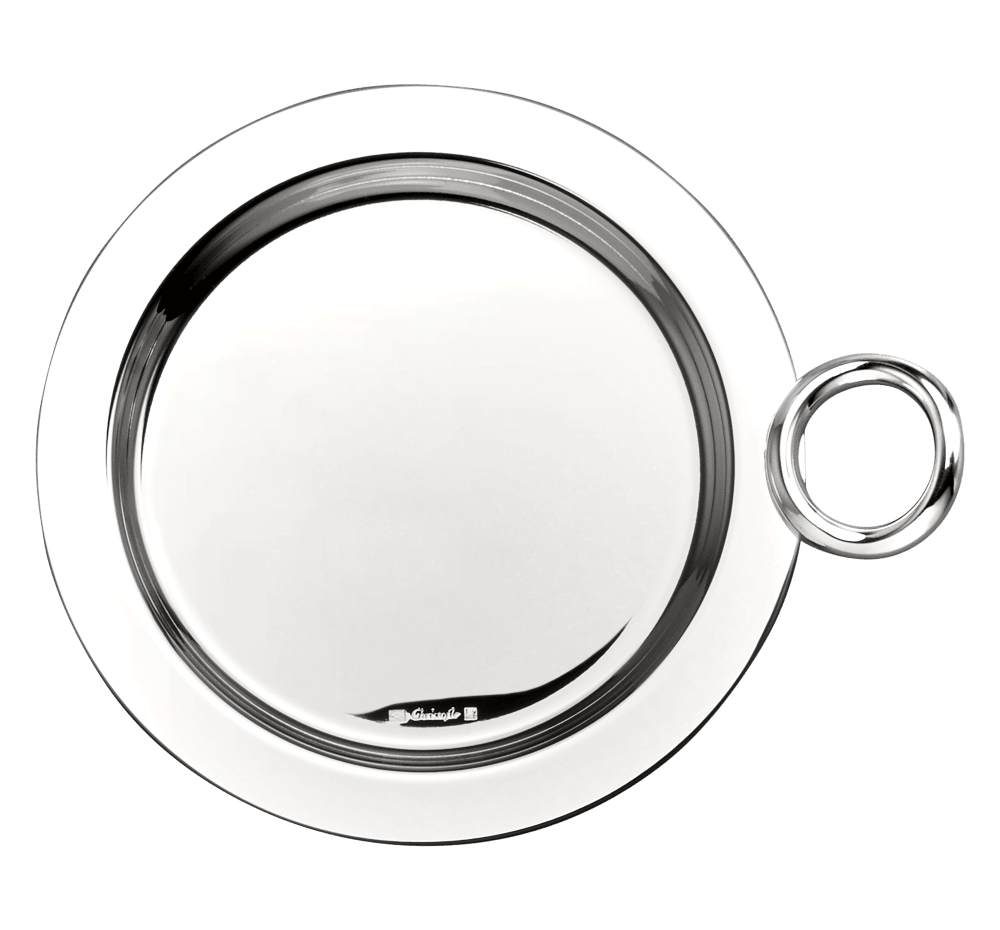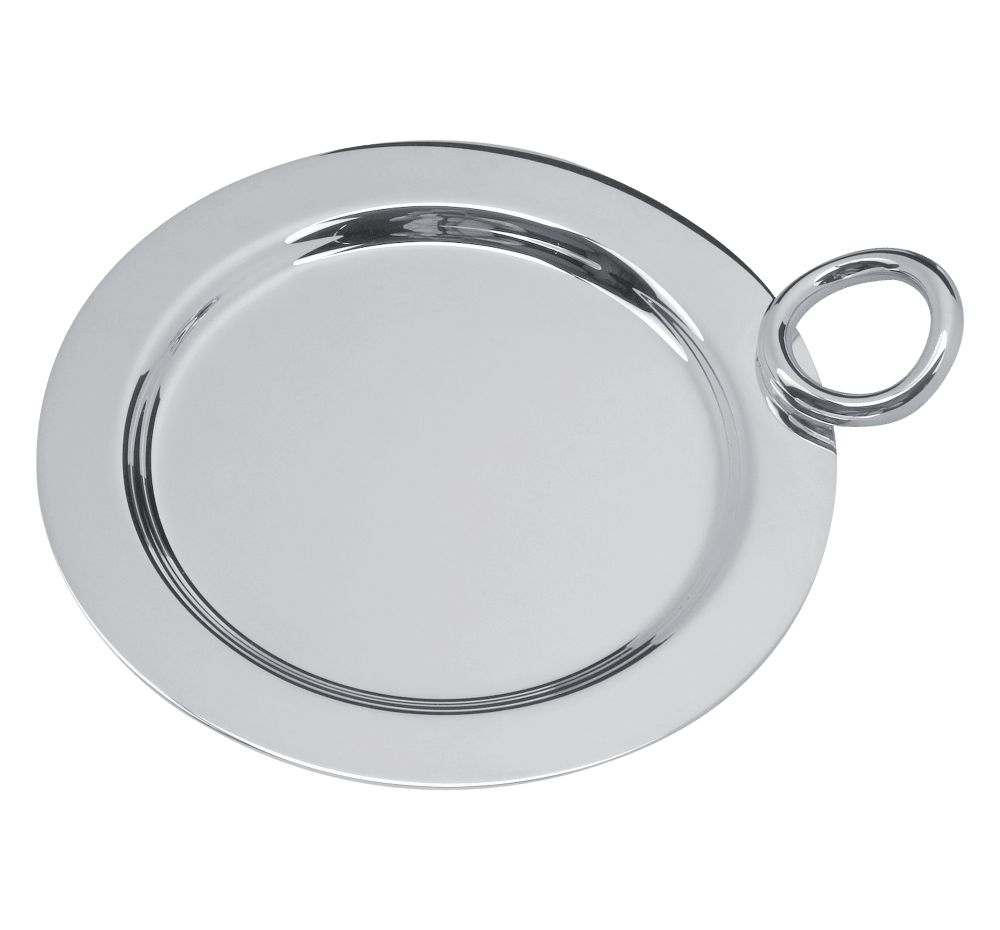 The silver plated coaster in the Vertigo pattern is designed to hold wine and water bottles as well as carafes and protect the table from condensation rings. Vertigo’s bold motif — a subtly asymmetrical, thick ring often placed playfully askew — can be found on every piece in the collection designed by Andrée Putman.