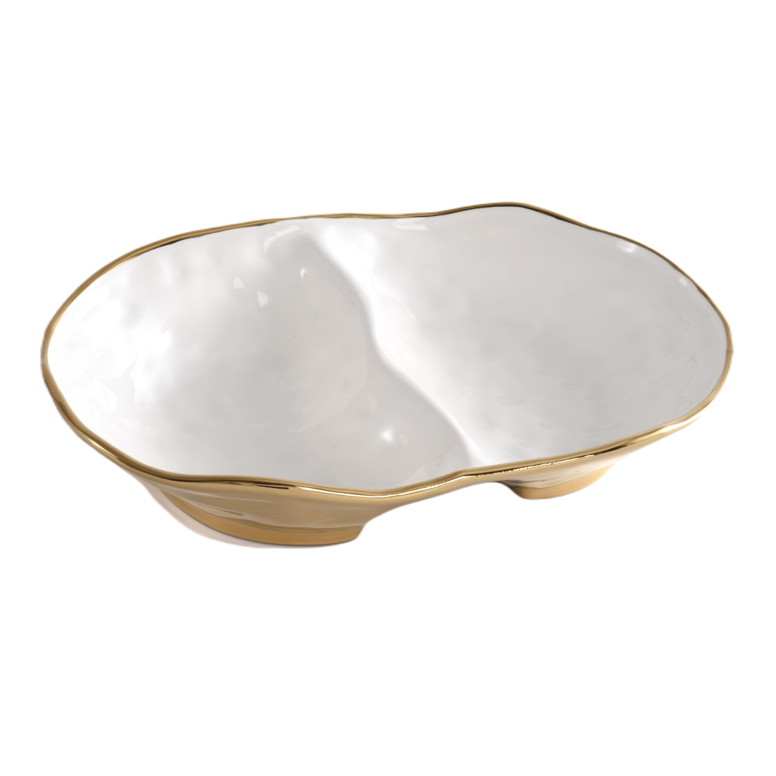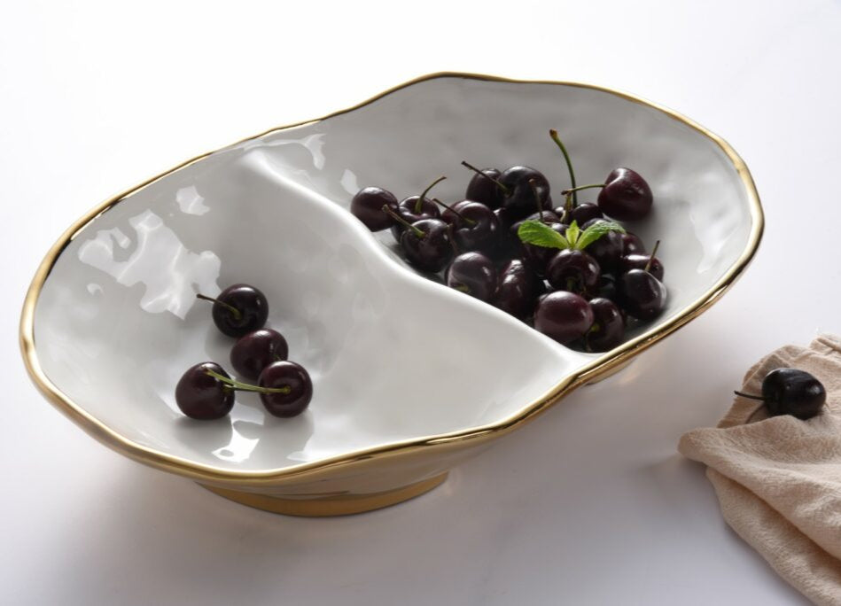 2 Section Bowl in Moonlight. Great for serving dip and chips, fruit, and an assortment of other irresistible treats. Crafted in a stunning white high-fired porcelain with gold titanium.